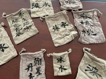 为了进一步提升产品附加值,我系师生创新将核桃青皮染布应用于麻核桃包装小布袋,并融合书法艺术,在每一个布袋上都书写了书法字句,这不仅是将传统文化与现代环保理念完美结合,更是让消费者在使用过程中感受到浓厚的文化气息。