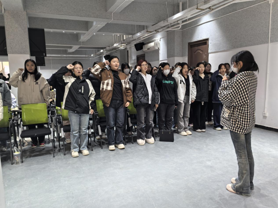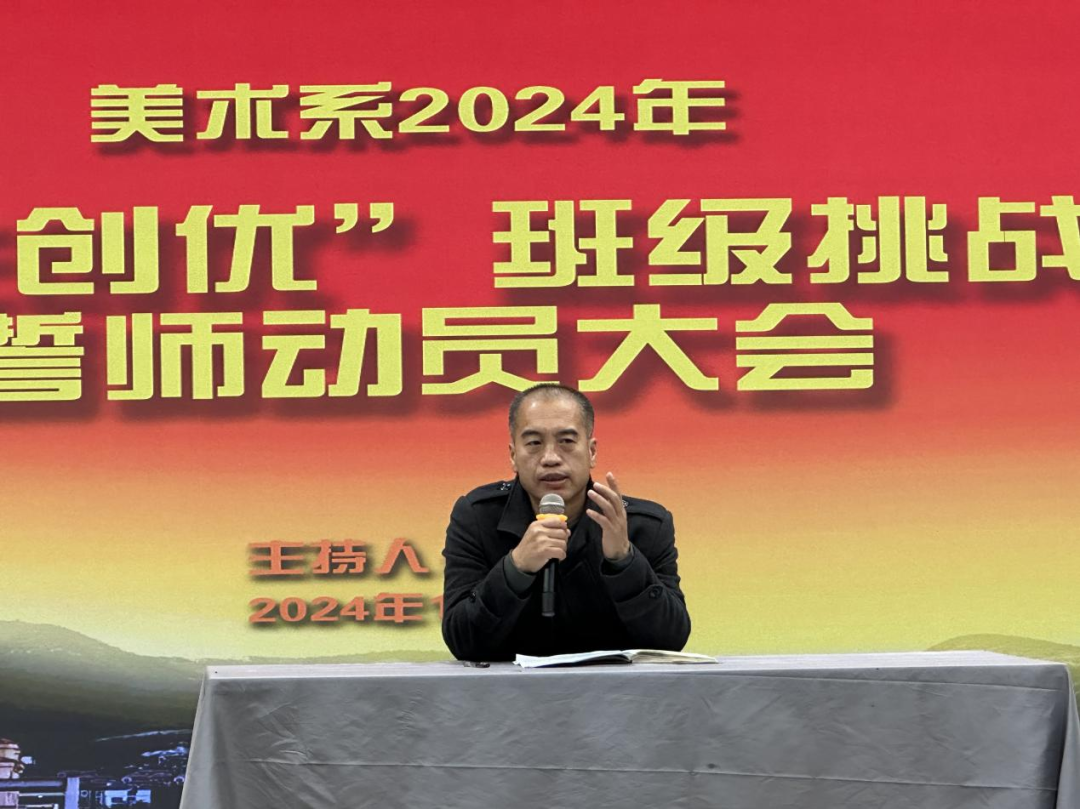 在全体师生的共同见证下,各班班长带领本班同学进行了庄严宣誓,同学们高举右手,齐声高呼班级勇于挑战、敢于争先的铮铮誓言。“美教五班,实力非凡,齐心协力,勇夺桂冠。”“雕塑三班,非同一般,奋勇直前,大干一番。”“国画一班,挑战开篇。笔绘山河,墨染华年。”“风起云涌,出水蛟龙,油画二班,傲视群雄。”“书法一班,青春激昂,共笔书写,同筑辉煌。”