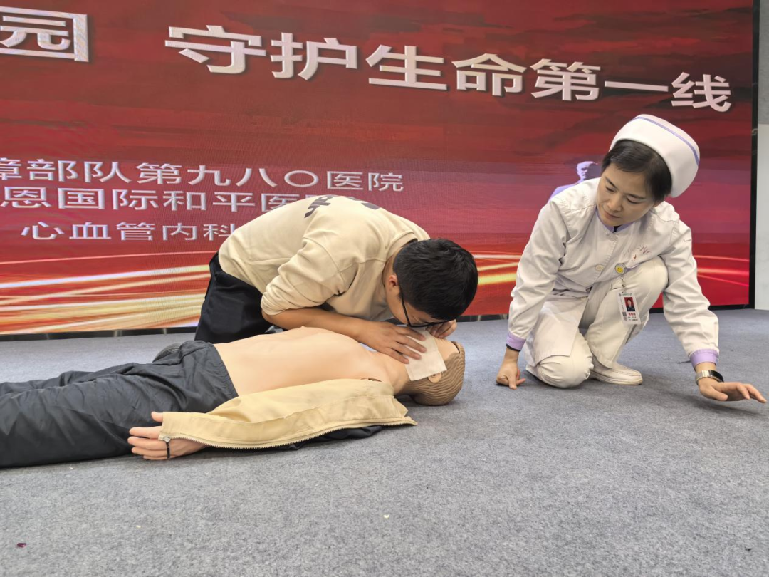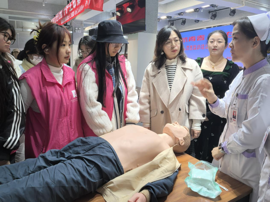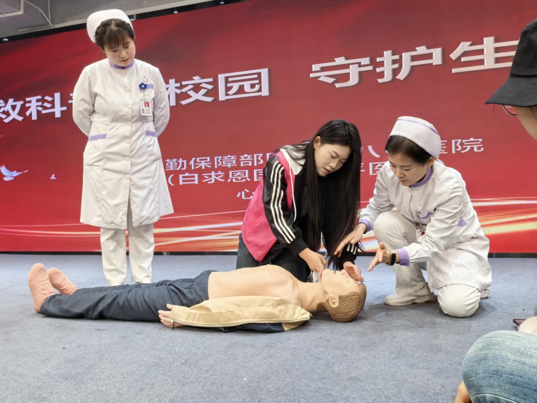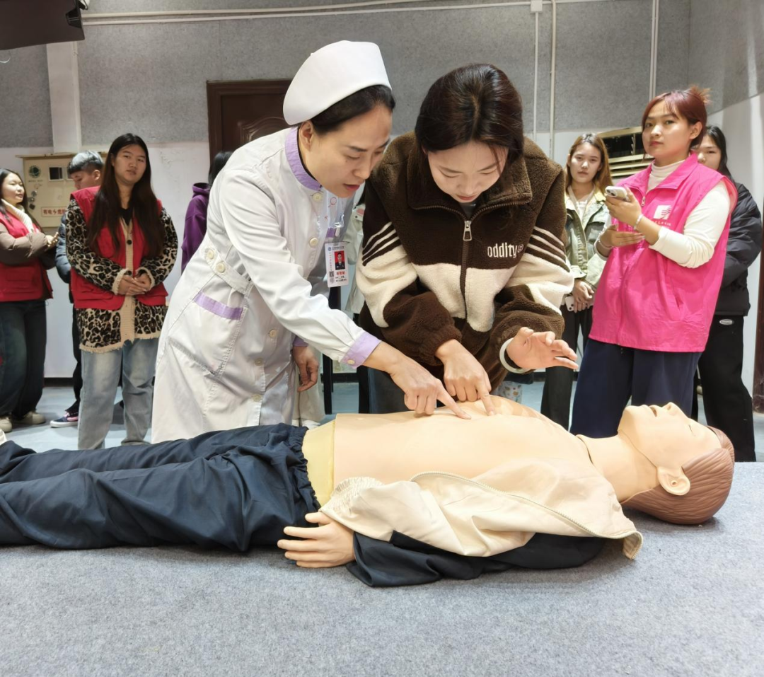 在分组练习环节,医务人员一对一进行现场指导,手把手传授技术要领,并进行反复示范,直到同学们做出正确操作为止,现场师生认真体验急救操作的每一个细节,一边体验一边请教,学习氛围十分热烈。