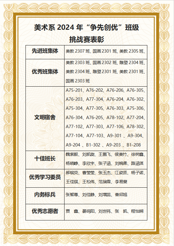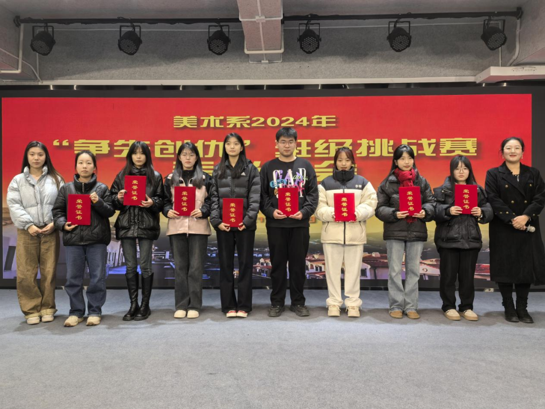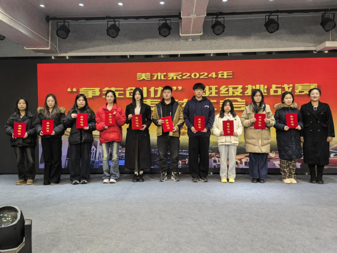 为进一步发挥班干部的引领示范作用,培养学生养成良好的生活习惯,营造更好的学习生活环境和积极向上氛围,美术系于2024年10月28日开启了为期一个月的“争先创优”班级挑战赛,一个月以来,参赛各班级积极进取,班干部骨干作用得到充分发挥,提升整体学风与班级凝聚力不断提升,为对在此次比赛中表现突出的班级和个人进行鼓励,让各班更好的延续“争先创优”的劲头,继续保持住当前良好的精神风貌,2024年11月25日,美术系艺术实践中心“争先创优”班级挑战赛表彰大会在多功能厅隆重举行。美术系2023级全体辅导员、学生代表等200余人现场参加。