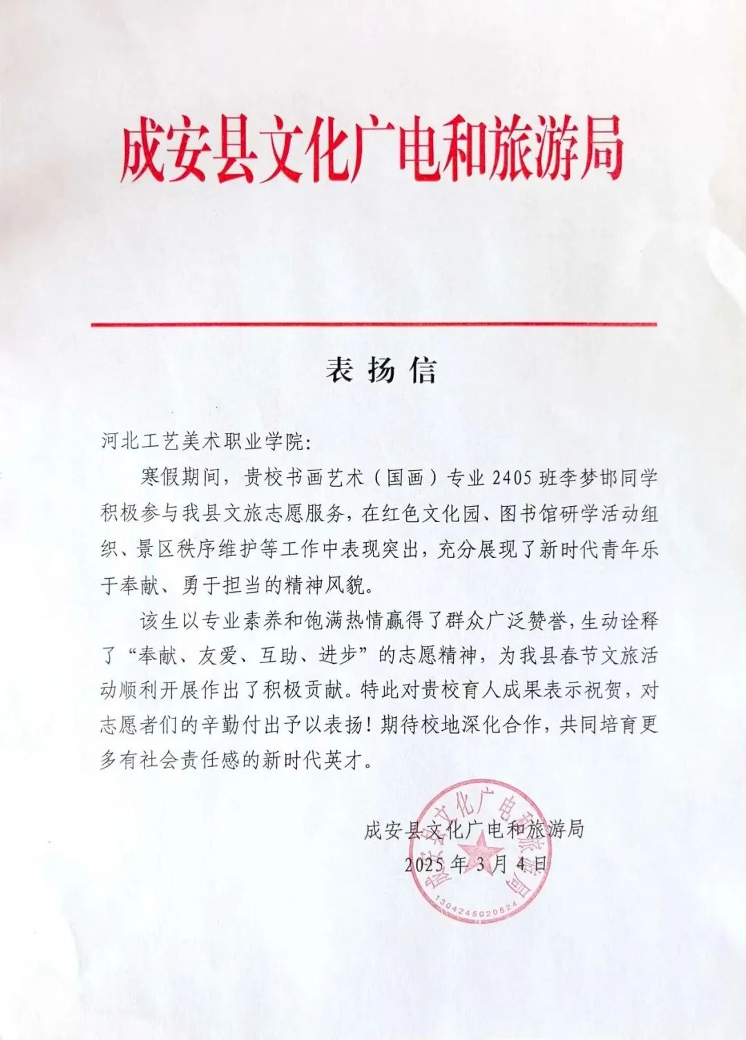 近日,邯郸市成安县文化广电和旅游局向我系发来一封表扬信。信中对我系书画艺术(绘画)专业国画2405班李梦邯同学在寒假期间参加“以书为友贺新春 图书馆里过大年”志愿服务活动中的优秀表现予以表扬和感谢,同时也向我校高质量育人成果表示祝贺,对未来育人合作充满期待。