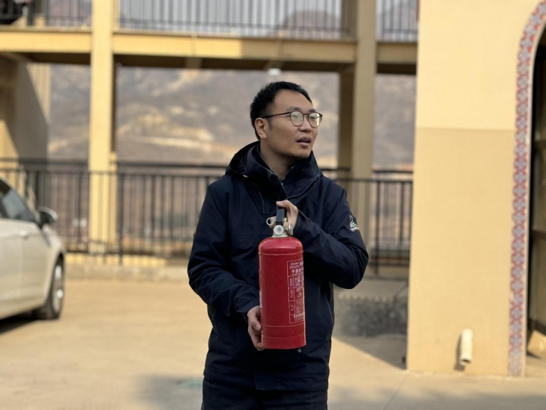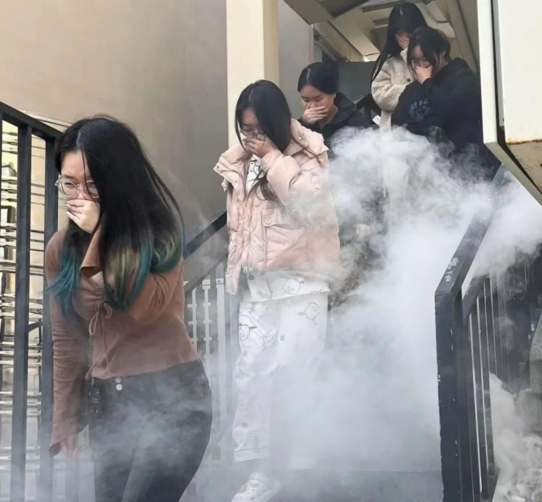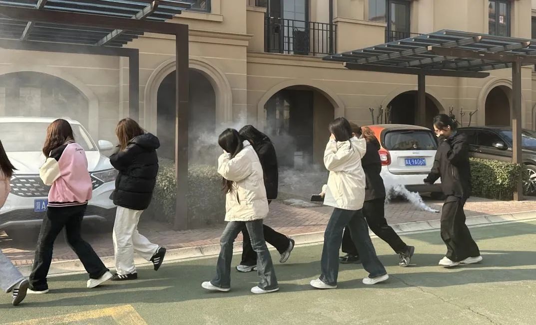 随着警报响起,教学区由任课老师组织,宿舍区由宿舍长组织,班长骨干在关键路口引导,保障疏散通道安全顺畅。同学们捂住口鼻,低姿弯腰按预定路线快速有序撤离,到达安全区域后,各班班长立即清点人数并向辅导员报告。随后进行灭火器使用演示,部分师生进行实操体验,有效提高了师生扑灭初火的能力。董雪在总结讲评中,再次强调了消防安全的极端重要性,表扬了表现好的班级和个人,指出了存在的问题,并提出了整改要求。