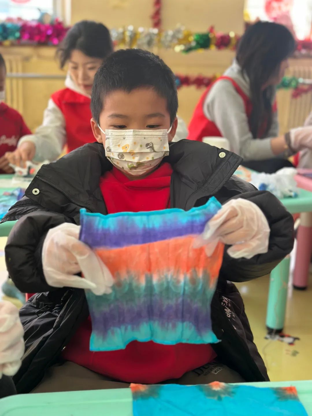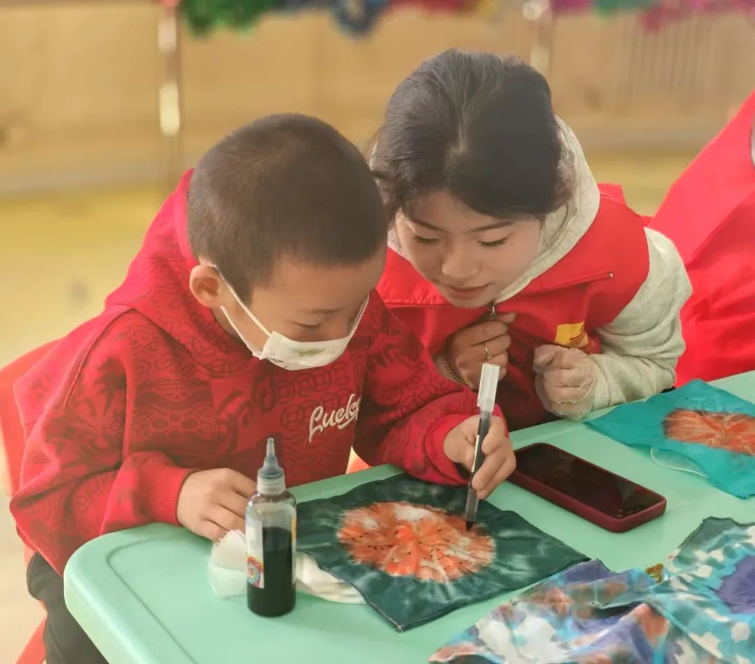 在志愿者的耐心指导下,孩子们开始了扎染创作。他们先将布料折叠成各种形状,用橡皮筋或夹子固定,形成独特的褶皱纹理。随后,选择喜欢色彩,使用扎染颜料滴染的方式在布料上创作。随着颜料的晕染和渗透,一幅幅独一无二的扎染作品逐渐成型。