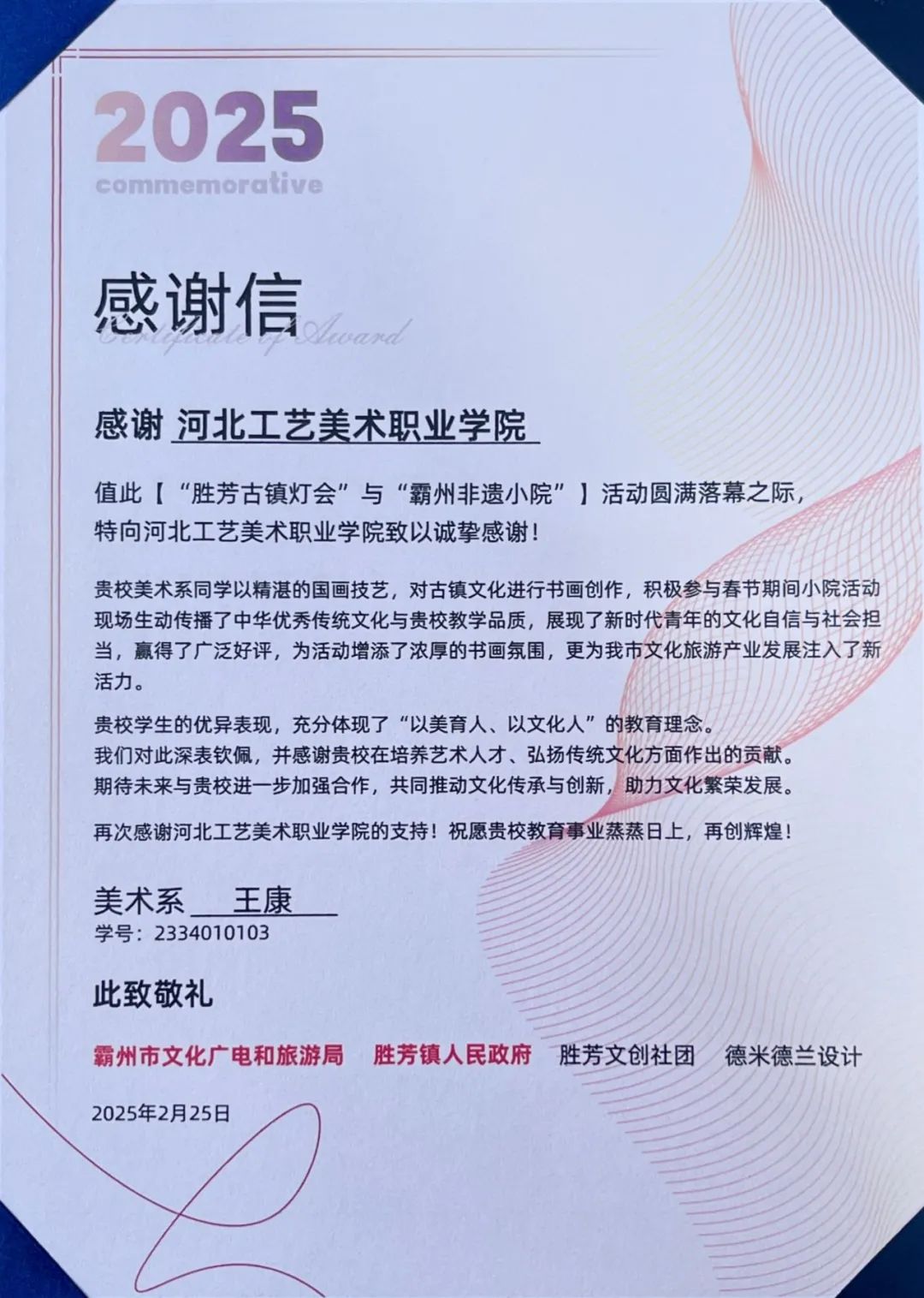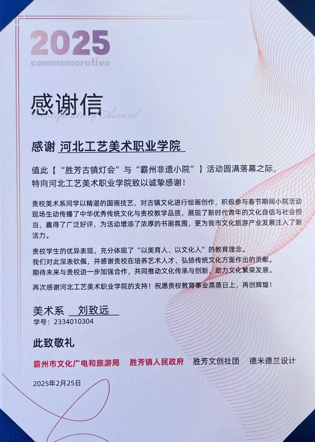 近日,霸州市文化广电和旅游局、胜芳镇人民政府、胜芳文创社团、德米德兰设计有限公司向我系发来感谢信,高度赞扬我系书画艺术(绘画)专业国画2301班王康、国画2303班刘致远两位同学在“胜芳古镇灯会”与“霸州非遗小院”志愿服务活动中的卓越表现,并表达诚挚感谢。