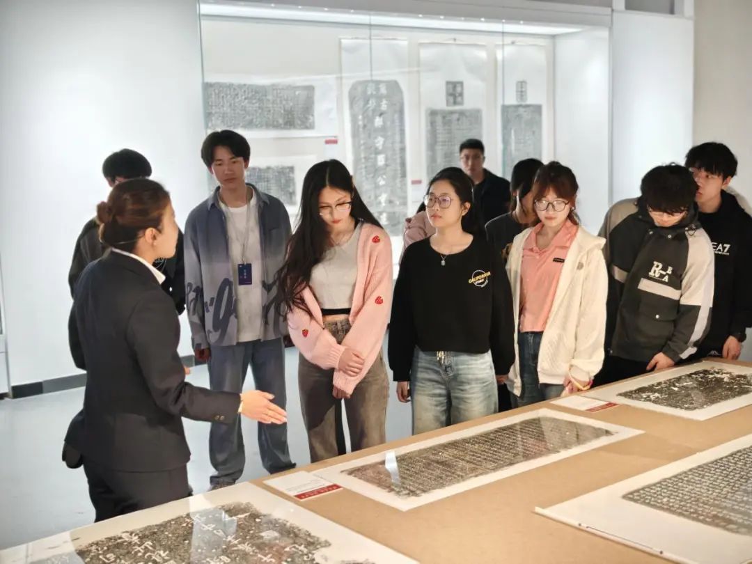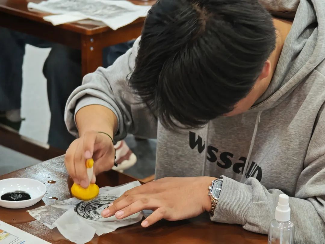 实践环节中,在老师的指导下,同学们手持棕刷、拓包、宣纸等传统工具,逐步解锁拓印技艺的实操步骤,最后通过轻重有序的拍打,让石碑上的文字图案在宣纸上徐徐显现。此刻,历史不再是展柜里冰冷的文物,而是通过指尖的触碰,在年轻的心跳里重新鲜活。