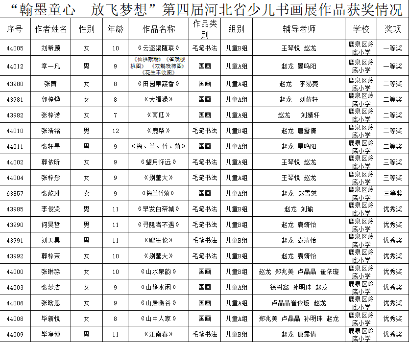 近日,“翰墨童心 放飞梦想”第四届河北省少儿书画展获奖名单正式揭晓。在我系师生的精心指导下,石家庄市鹿泉区岭底小学19名学生在展览中表现亮眼,一举斩获多项荣誉。这一成绩不仅充分展现了岭底小学学子在书画创作领域的蓬勃创造力,更展现了我系扎实的教学指导水平与卓越的育人成效。
