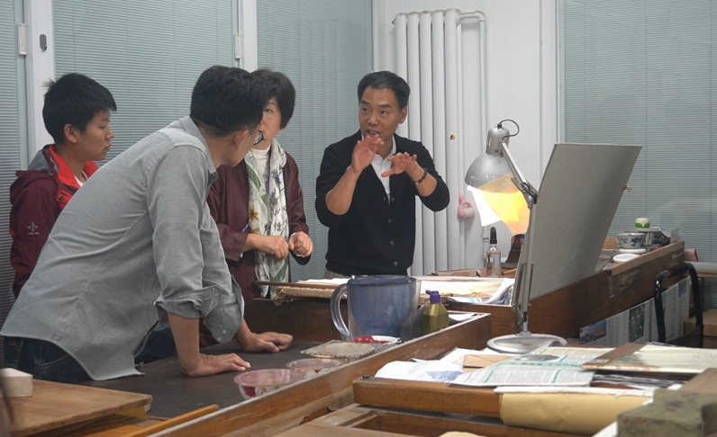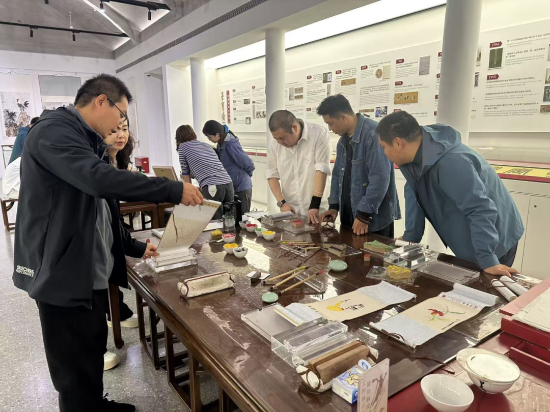 在荣宝斋总部,国家级非遗传承人亲自讲解核心工序,分享经典案例,从美术馆内珍贵书画作品的装裱技艺欣赏,到文房文创区传统非遗元素与现代设计融合的文创产品观摩,再到木版水印车间、装裱修复车间的深度探访,让考察团成员对荣宝斋的非遗技艺传承成果与文化底蕴有了直观且深刻的认识。