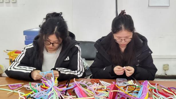 随后,同学们充分发挥美术专业特长,以五彩扭扭棒为材料,巧手构思、精心编织,在折、扭、绕、粘的细致操作中,创作出一束束满载心意的手工花束。大家手捧花束走进宿舍、食堂,将花束送到宿管阿姨、食堂阿姨手中,向坚守在校园平凡岗位的巾帼劳动者们送上节日的祝福与最诚挚的感谢。