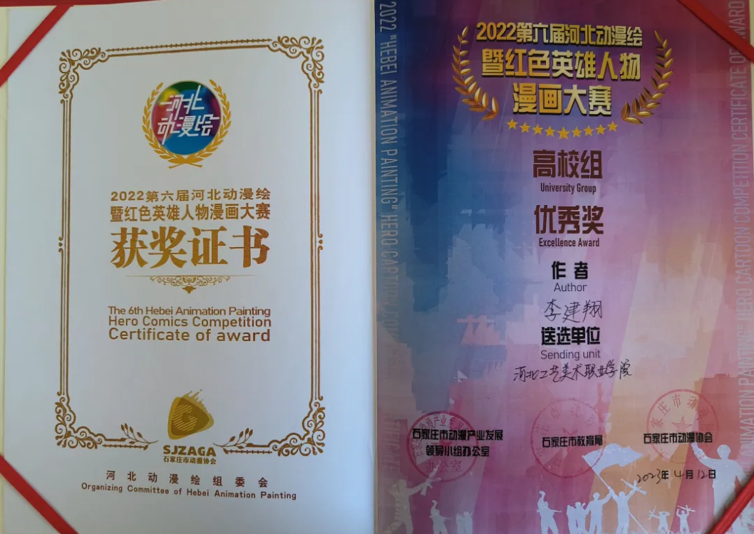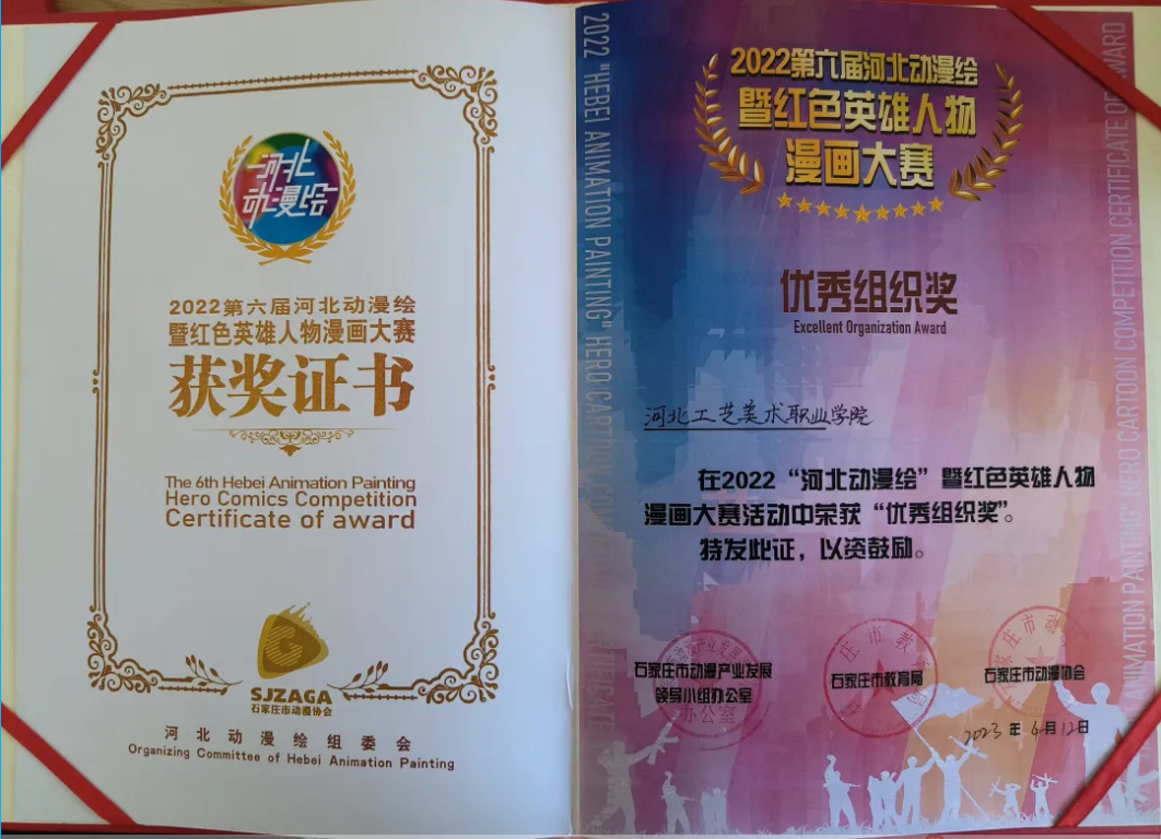 本次“河北动漫绘”暨英雄人物漫画大赛中,河北工艺美术职业学院荣获优秀组织奖。王博、霍燃、黄琪、刘子莹、王晓桐五位老师被评为大赛优秀指导教师。
