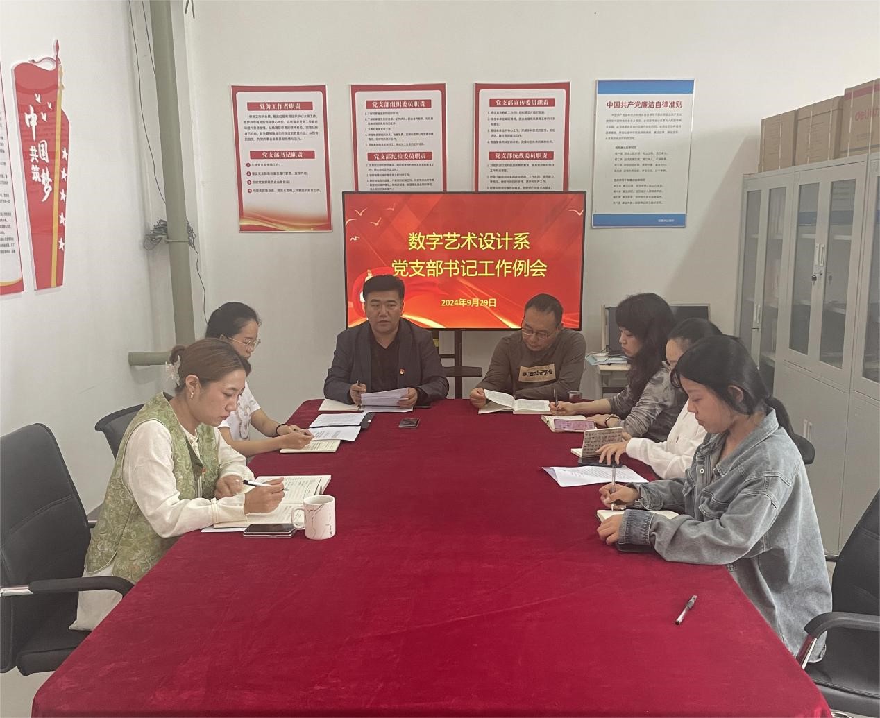 为深入贯彻落实新时代党的建设总要求和新时代党的组织路线,全面落实学院党委关于全面从严治党工作部署,2024年9月29日,数字艺术设计系在党建活动室召开了党支部书记工作例会。会议由党总支书记李建新主持,数字艺术设计系党总支委员、各党支部书记参加会议。