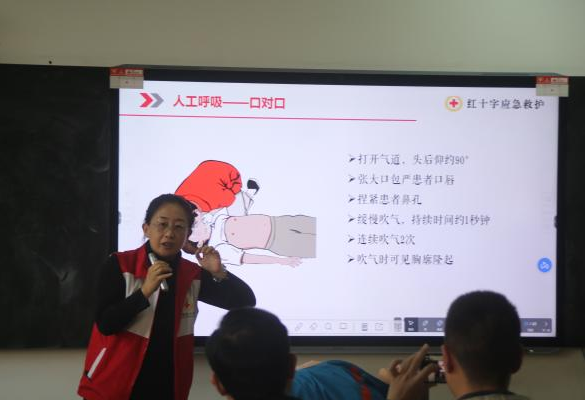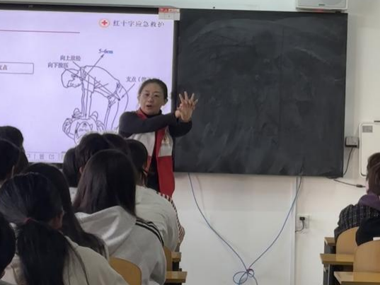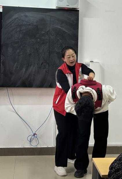 当天下午的培训中,纪老师详细讲解了应急救护的注意事项和心肺复苏的急救步骤,及时纠正学员的错误思想和不规范操作。她还亲身示范了胸外按压的方法,并与同学互动演示了背部叩击法和海姆利克急救法,现场学习氛围热烈,取得了良好效果。