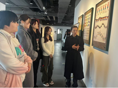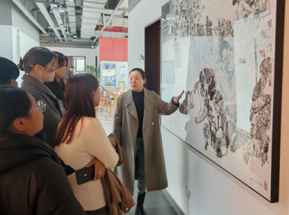 王沫老师带领师生参观了校内陈列的艺术作品,通过在现场分析金政基作品,结合《动漫造型基础》课程,帮助学生吸收作品内容、总结绘画技法,提高学生眼界、转化经验并运用到专业创作。