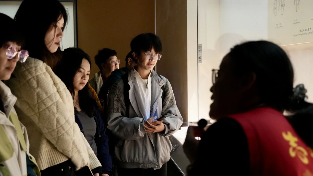 武翼飞老师在场馆指导学生们临摹文物,他通过对文物造型的细致分析,引导学生们从多个角度进行观察,从而探寻古人的设计思路。