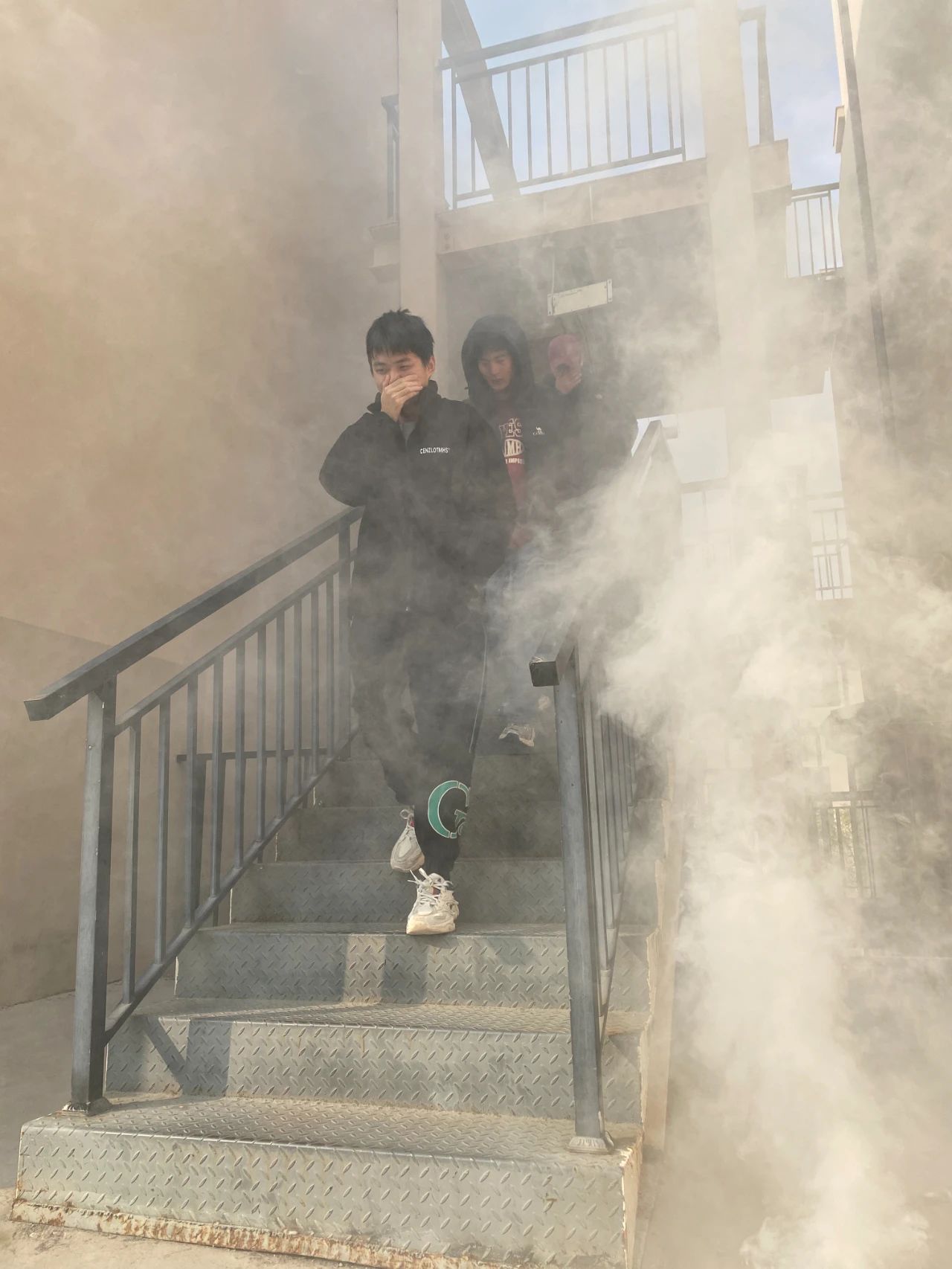 为了确保全员参与,负责人在13时45分准时拉响消防警报。学生们听到警报声后,迅速且有秩序地跑出宿舍。在疏散过程中,引导员指导学生采取正确的逃生姿势,即“弯腰、捂口鼻”。