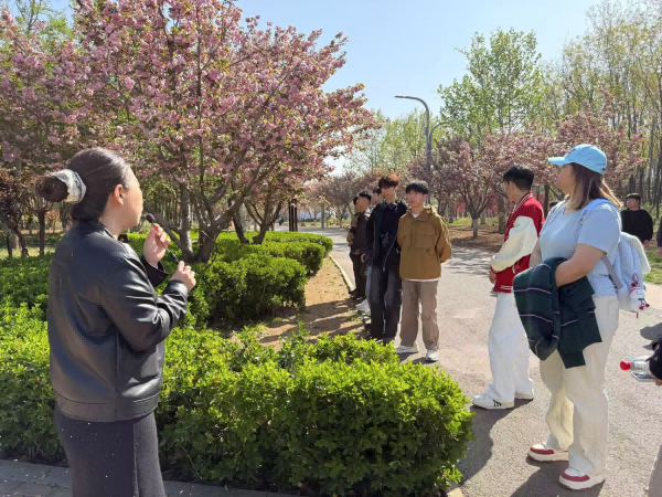 上午9时,师生们准时抵达龙泉湖湿地公园。此次活动得到了龙泉湖园林事务中心的大力支持,园林专家特别为师生们开设了一堂“樱花科普小课堂”。专家生动讲解了樱花的品种、生长周期及其在中外文化中的象征意义,如中国古典诗词中樱花寄托的哀愁与思念,不仅拓宽了学生的知识视野,还为他们后续的短视频创作提供了宝贵的灵感和素材,更激发了他们对文化多样性的尊重与好奇,为培养具有国际视野与文化自信的新时代青年奠定了基础。