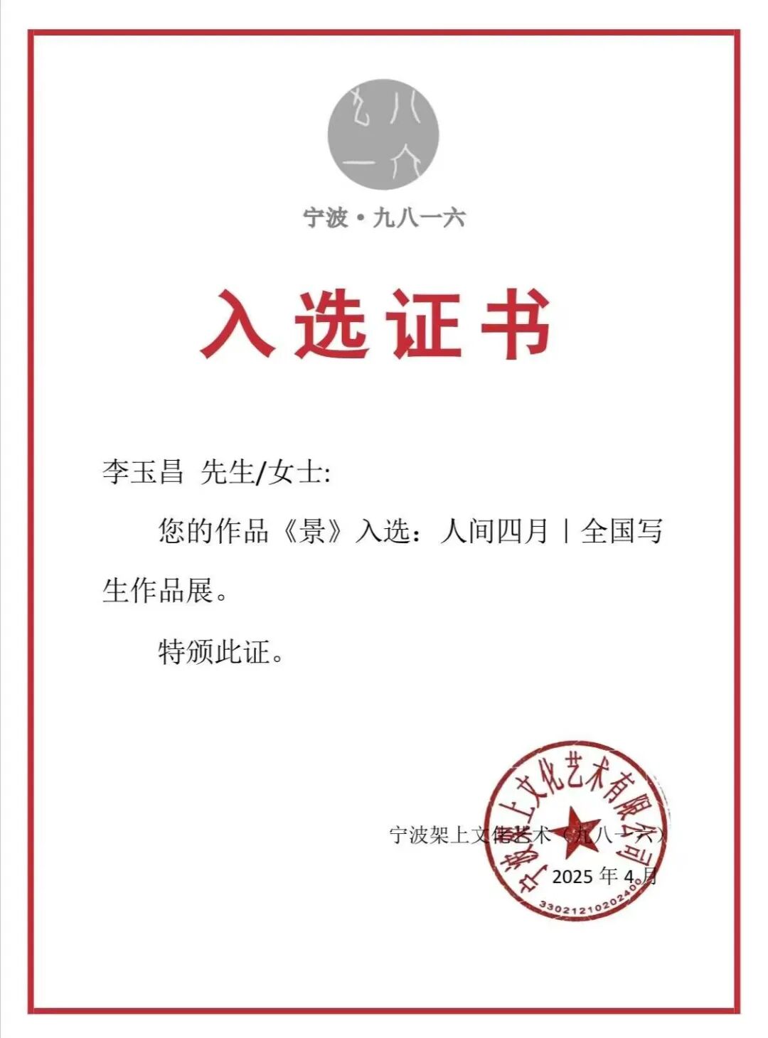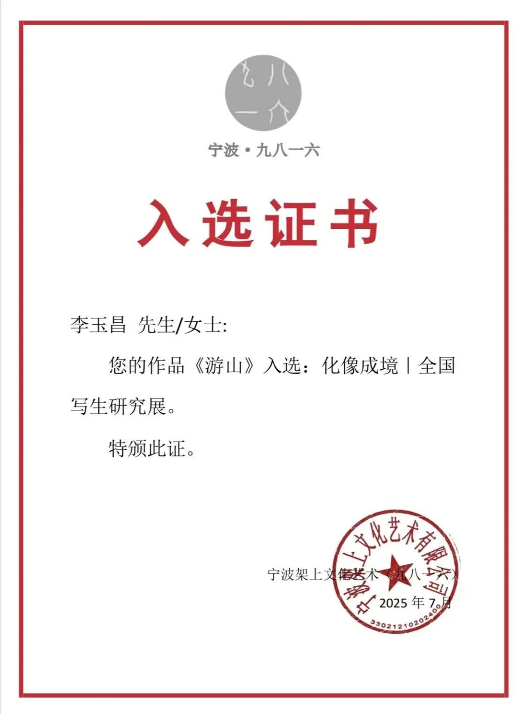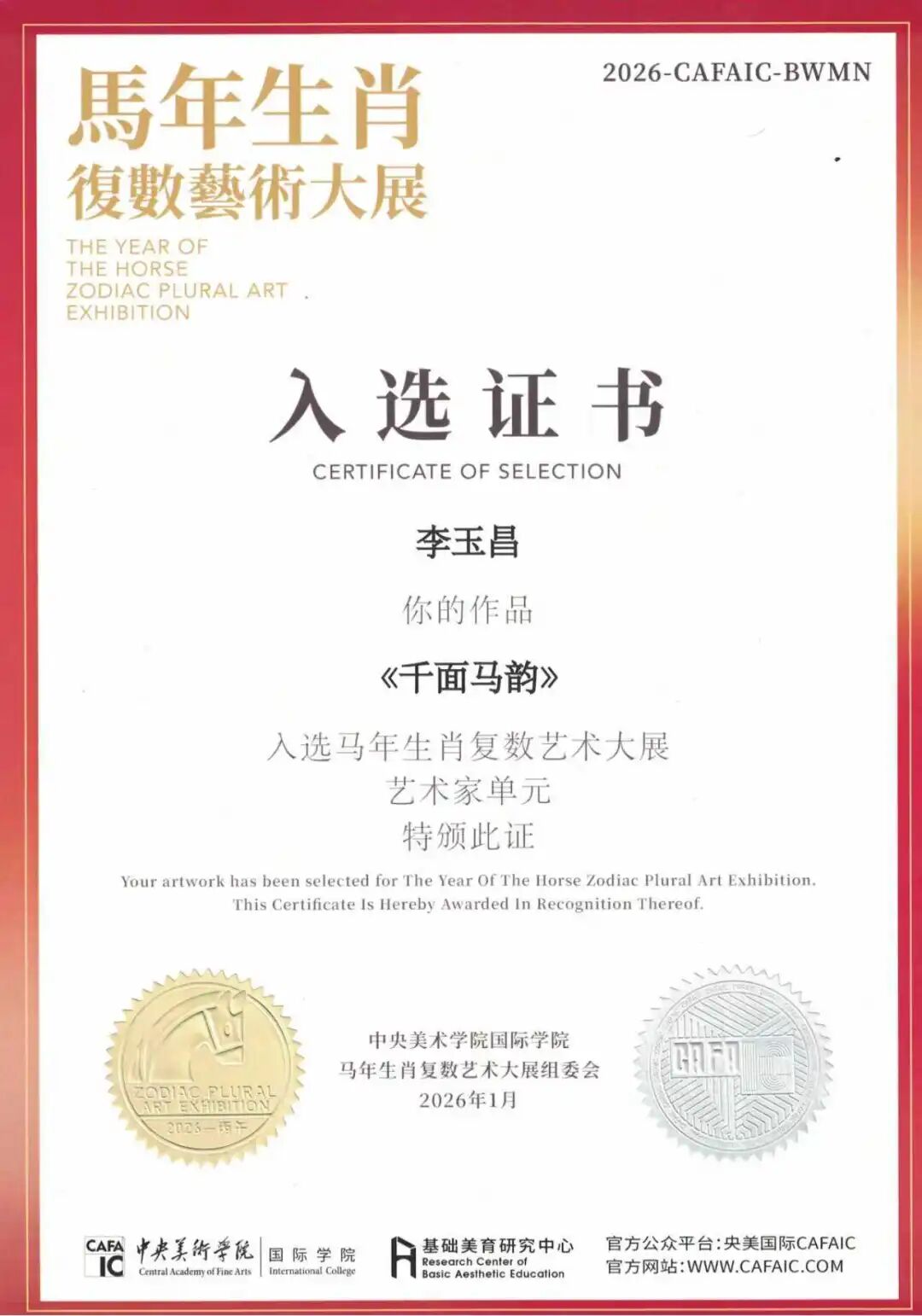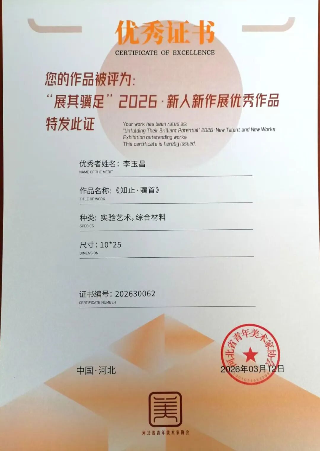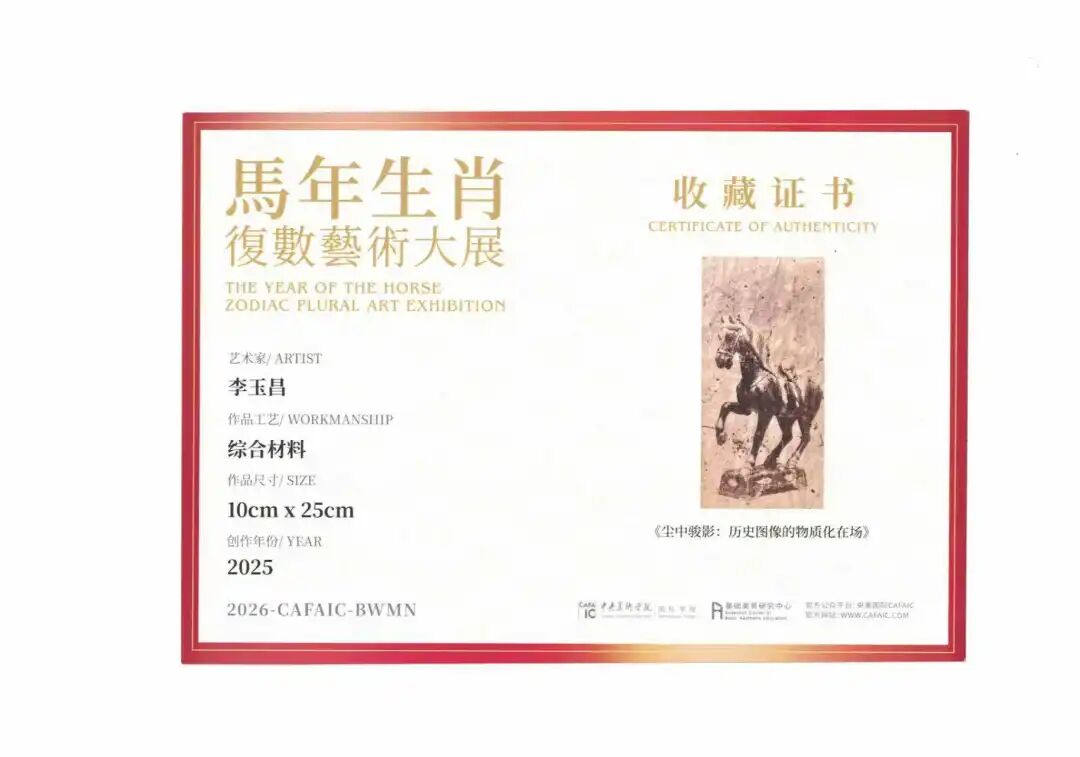 李玉昌同学在艺术创作的道路上步履不停。2025年,他的作品连续入选“宁波架上文化全国写生作品展”“宁波架上文化全国写生研究展”以及“中央美术学院马年生肖复数艺术大展”,展现出扎实的创作功底与多元的艺术探索。2026年初,他的作品,在“‘展其骥足’2026新人新作展”中荣获“优秀作品”称号。这一系列荣誉,既是对他艺术潜力的认可,也见证着他在创作道路上的持续深耕与稳步成长。