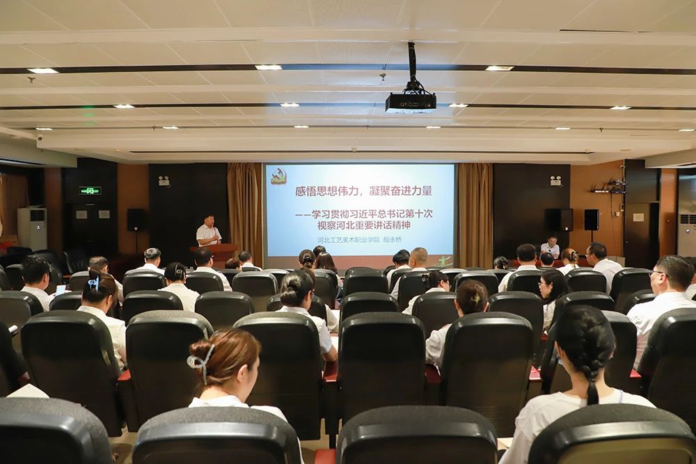 殷永桥强调,我们要深入开展学习贯彻习近平新时代中国特色社会主义思想主题教育,推动全面从严治党向纵深发展。要以主题教育为契机,坚持不懈用习近平新时代中国特色社会主义思想凝心铸魂。坚定不移沿着习近平总书记指引的方向奋勇前进,加快建设经济强省、美丽河北,奋力谱写中国式现代化建设河北场景工美篇章。风劲扬帆正当时,踔厉奋发踏征程。强国建设、民族复兴的宏伟目标令人鼓舞、催人奋进。学院的高质量发展需要我们大家共同努力。