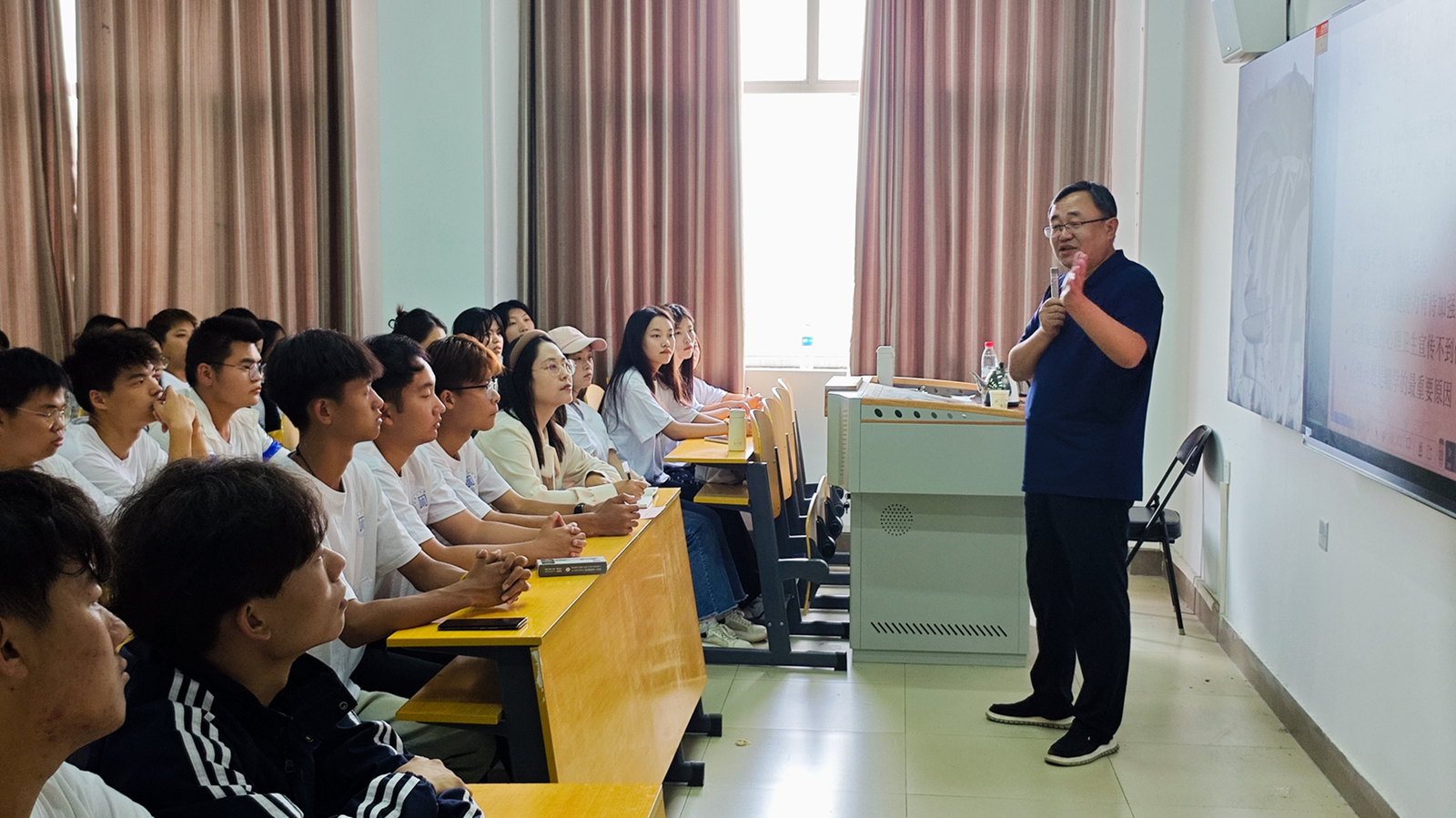 徐涛主任风趣幽默地为师生梳理了大学生心理现状,引导同学们在学习生活中,勇闯人际关系关、生活适应关,调整状态关,从而收获美好的开端,阔步迈向新征程。