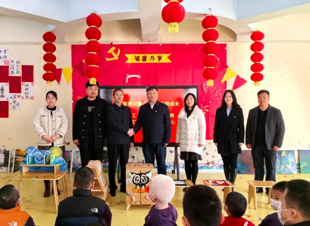 活动中,与会领导和企业代表一同向福利院捐赠由我校师生共同设计、制作的家具作品和绘制的绘画作品,鼓励福利院的孩子们在祝福中健康快乐成长。