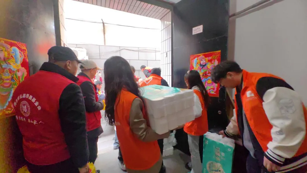 志愿者早早抵达集合地点,搬运慰问物资,肩扛手提间展现青春力量。