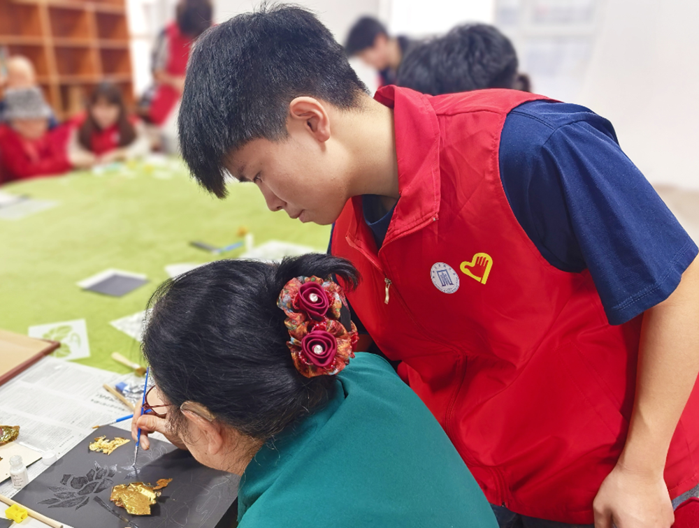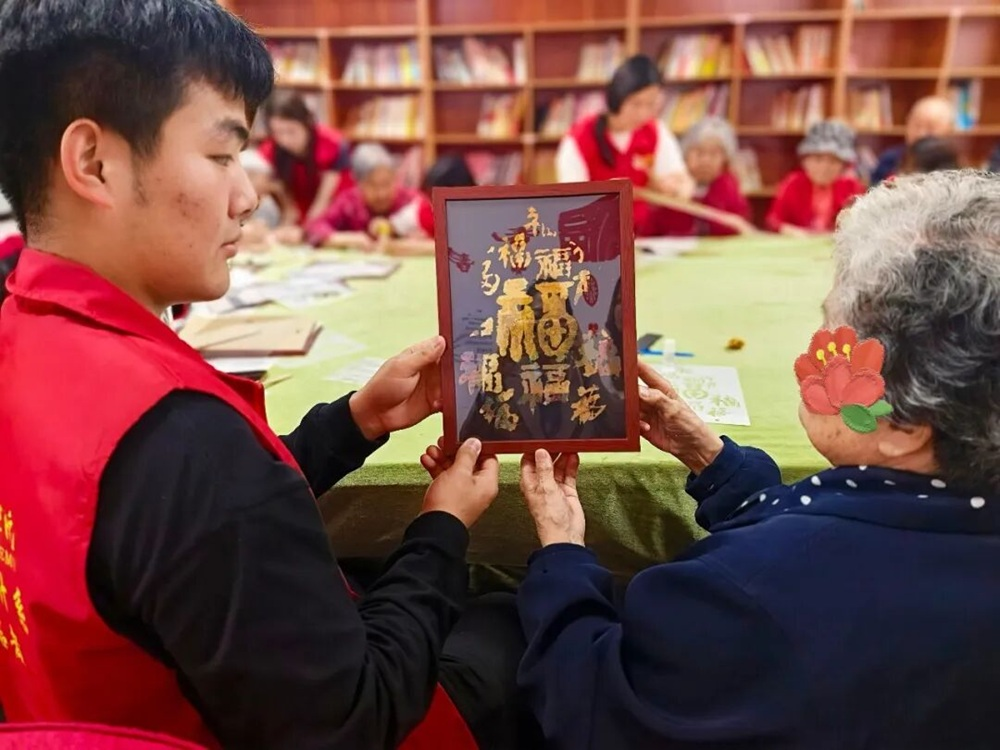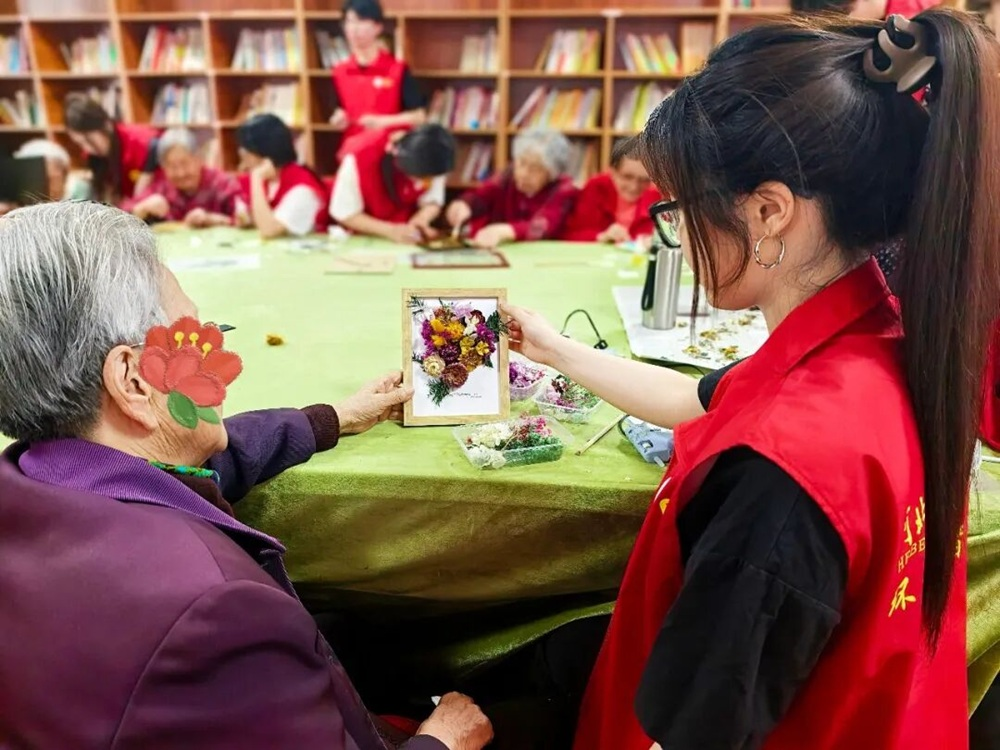 活动中,志愿者与老人亲切交谈,细致询问其身体状况,传递真挚关怀。同时,志愿者精心准备了金箔“福”字、干花相框、创意团扇等手工材料,与老人们共同完成作品创作,在互动协作中体验艺术乐趣,现场氛围温馨融洽。