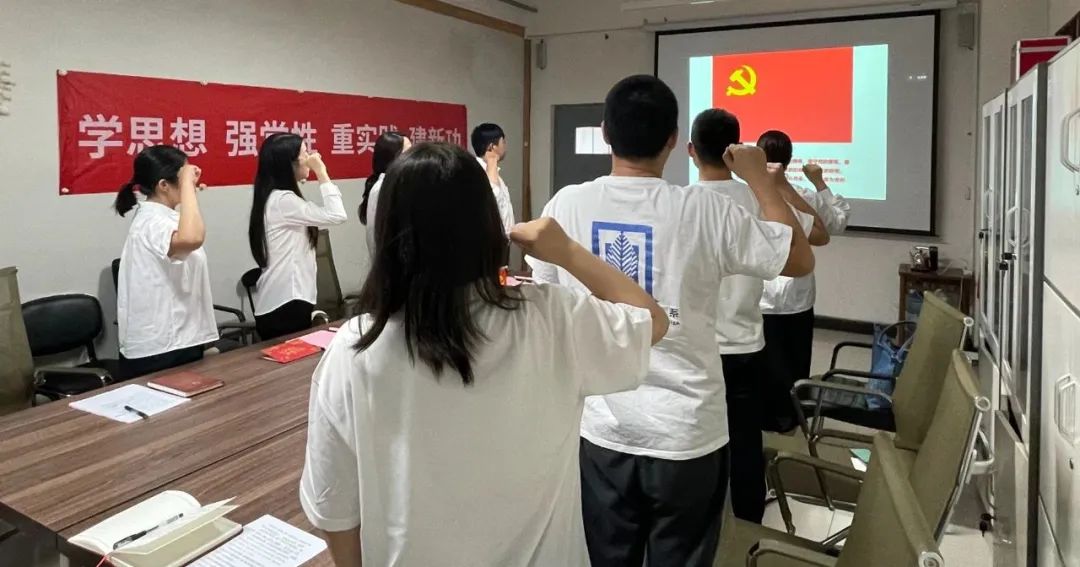 在鲜红的党旗前,全体党员紧握右拳,重温入党誓词。铿锵有力、掷地有声的誓词激励大家时刻保持共产党员的先进性、纯洁性,在新征程上以实实在在的行动诠释对党、对人民的赤诚之心,努力做新时代合格的“答卷人”。