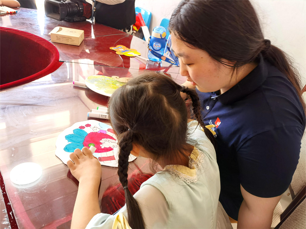 以专业特长为依托,遵循美育特点,将思想政治教育与美育教育相结合,环境艺术设计系实践小分队开展“童心向党,共绘未来”手绘团扇活动,活动不仅提高了实践成员的教育实践能力,同时也达到美育浸润心灵的效果。