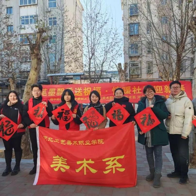 为弘扬中华优秀传统文化,充分发挥党建引领和党员先锋模范作用,2025年1月7日上午,河北工艺美术职业学院美术系艺术实践中心师生联合石家庄市桥西区东风街道槐中路社区党委,在石运小区党群活动广场开展“笔墨飘香送祝福,情暖社区迎新春”写春联、送祝福主题活动。美术系书法专业教师孙宙、美术系党总支师生二支部书记赵龙、党员常文超、董雪带领10余名学生志愿者与槐中路居委会党委书记李澄和社区志愿者共同参加了活动。 活动