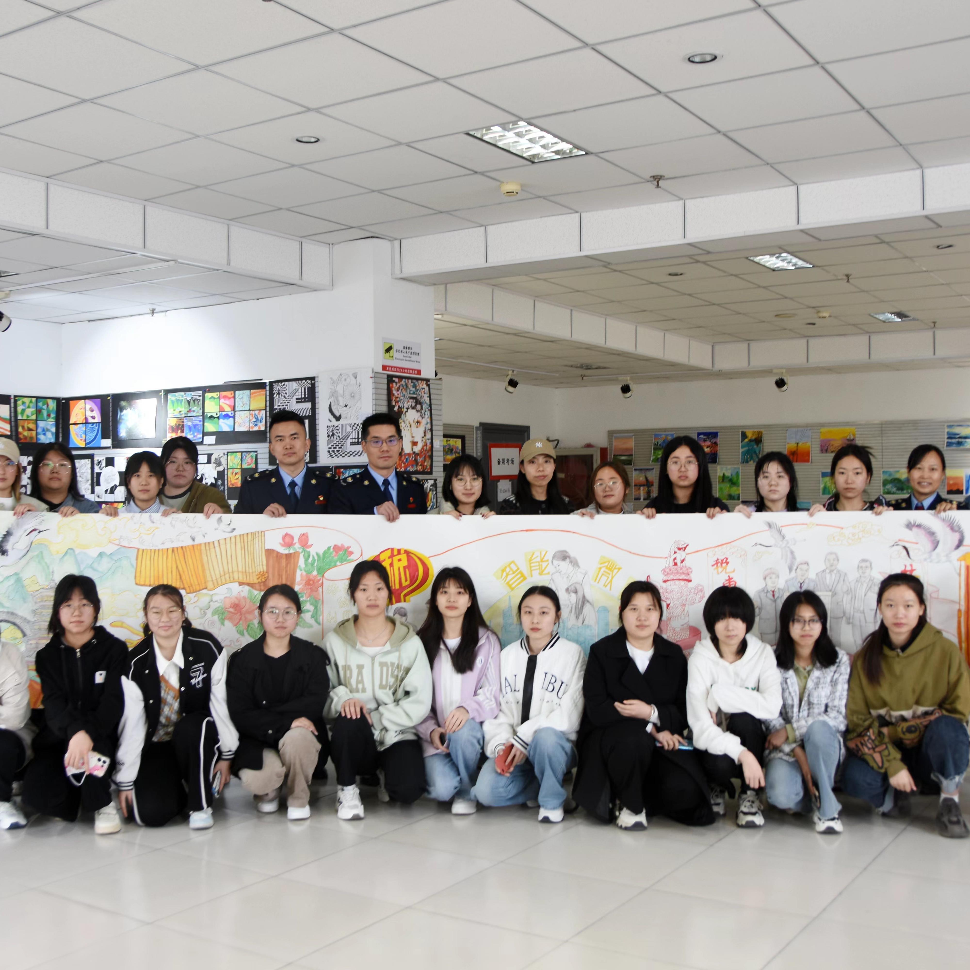在第32个全国税收宣传月来临之际,保定市莲池区税务局联合我系师生共同开展税法宣传活动。活动中,师生同税务干部用画笔绘就了一副税收画卷。大家精心构思、巧妙设计,将“税”元素融入其中,既有优秀传统文化中的山水画元素,又展现了现代化税收中的“智慧微厅”“精细服务”等元素,体现了税收助力社会发展的巨大作用,展现了税务干部服务纳税人缴费人的生动画面。整幅作品主题鲜明、立意深刻、创意新颖、构图协调,充分展现
