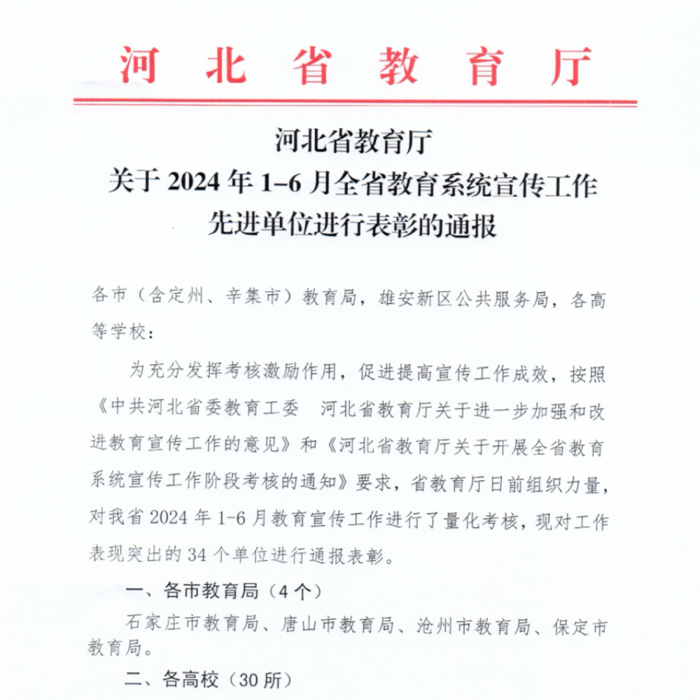 赞!我校获评河北省2024年1-6月教育宣传工作先进单位