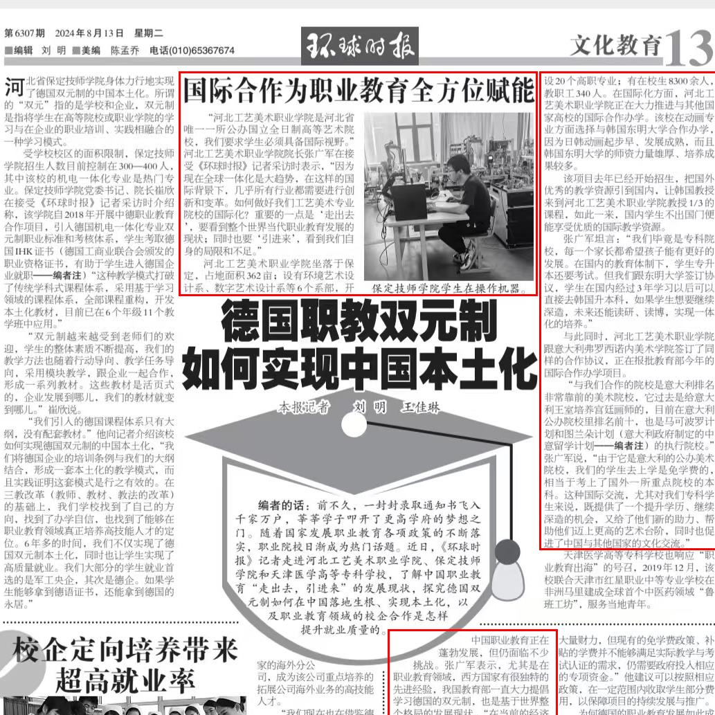 2024年8月13日,《环球时报》文化教育版以《德国职教双元制如何实现中国本土化》为题刊登校长张广军的采访。我校始终坚持以习近平新时代中国特色社会主义思想为指导,全面学习贯彻党的二十大精神,落实习近平总书记关于教育的重要论述和职业教育工作重要指示精神,不断深化职业教育国际合作,不断提升我校职业教育国际化水平,服务教育强国建设,为职业教育国际化贡献力量。