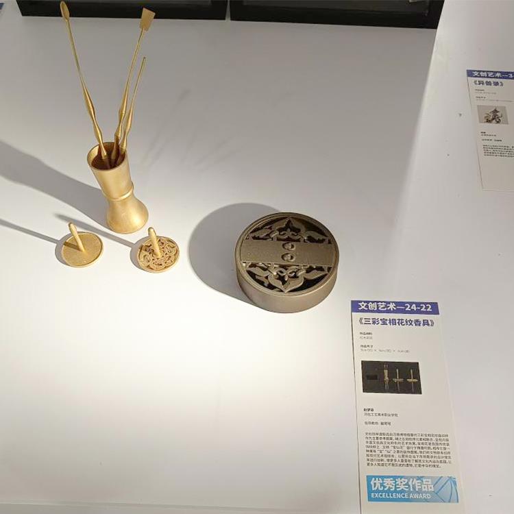 “首届全国工艺美术教育大会”于2023年10月21日在福州大学鼓浪屿校区隆重开幕。会上公布了“第二届全国大学生‘毕业季’工艺美术类优秀毕业作品大赛”评审结果,我院时尚工艺系20级蒋旌立、王馨月、刘晶、赵梦菲四名同学的作品成功入选参展,其中由杜可可老师指导的赵梦菲作品《三彩宝相花纹香具》在全国60余所高校共计7000多件作品中获得优秀奖。