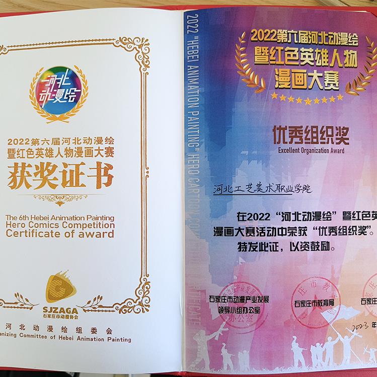 数字艺术设计系在进行“插画与漫画”这一教学任务中,组织学生参加2022“河北动漫绘”暨红色英雄人物漫画大赛。赛事以河北红色英雄人物原型为蓝本进行漫画创作。弘扬红色英雄的伟大事迹和光辉形象,引导学生回望历史,感悟爱国青年为国奉献的高尚情怀,在提升专业技术水平能力过程中加强学生自身思想道德建设。本次“河北动漫绘”暨英雄人物漫画大赛中,我院荣获优秀组织奖。王博、霍燃、黄琪、刘子莹、王晓桐四位老师被评为大赛