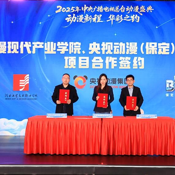 12月19日,在中央广播电视总台CMG动漫盛典——动漫新程·华彩之约活动上,央视动漫现代产业学院签约落地保定。该学院由央视动漫集团、保定市动漫产业协会与河北工艺美术职业学院三方共建,是央视动漫(保定)创意产业基地的首个落地项目。作为共建高校,我校将依托在动漫设计、数字艺术等领域的专业优势,深度参与产业学院建设,在人才培养、课程开发、实践教学和项目孵化等方面与产业紧密对接,探索产教融合、校企协同育人的新模