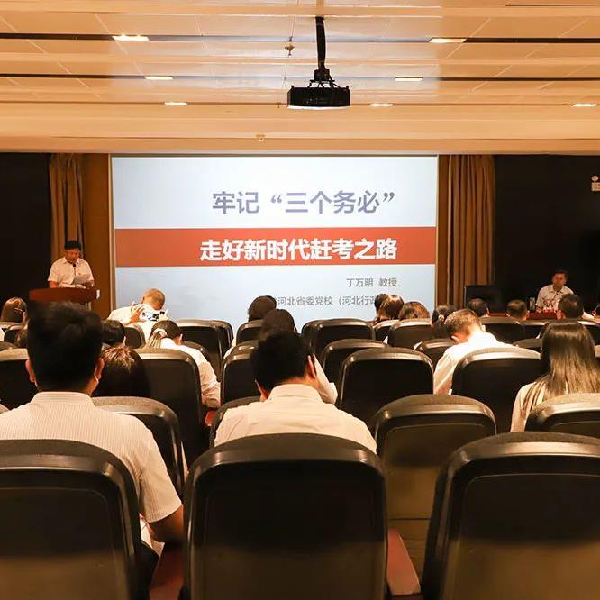 为进一步推动学习习近平新时代中国特色社会主义思想走深走实、取得实效,5月16日下午,河北省委党校教授、央视百家讲坛主讲人丁万明教授应邀为我院习近平新时代中国特色社会主义主题教育读书班做题为“牢记‘三个务必’,走好新时代赶考之路”的专题讲座。学院党委书记殷永桥、院长张广军、党委副书记赵云耕、纪委书记王立新、副院长杨庆华,全体中层干部,各党支部书记和委员参加会议。